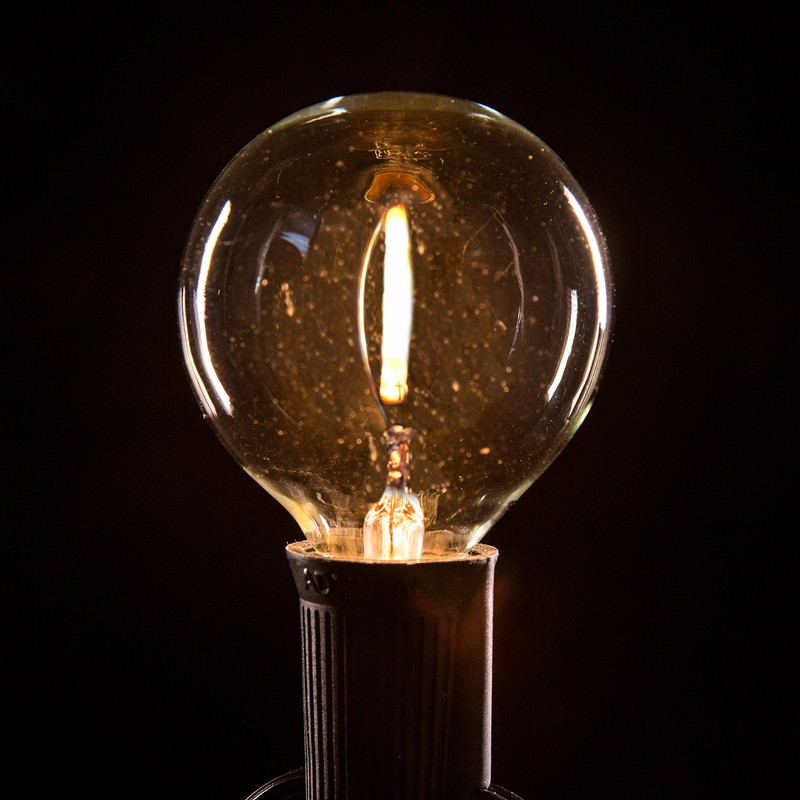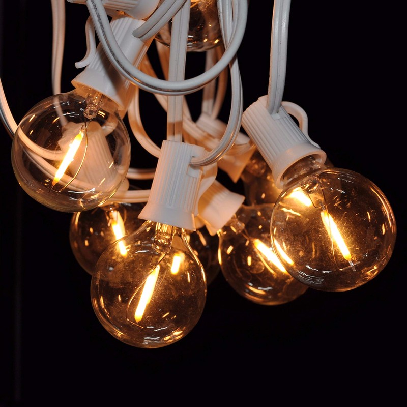- Go green with LED string lights. Set includes one 10 foot White light string and 10 G50 Clear 2” LED Filament globe light bulbs. Weatherproof lights designed for outdoor use year round.