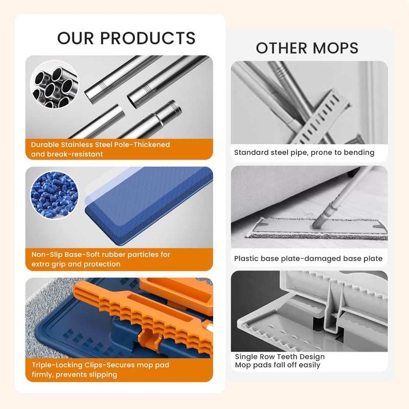 - Innovative Triple-Clamp Design & Eco-Friendly Pads: Featuring a secure triple-clamp design, this mop is compatible with various cleaning materials, making it adaptable for different tasks. The washable pads are eco-friendly and economical, ensuring easy, sustainable cleaning that fits any mops for floor cleaning routine.