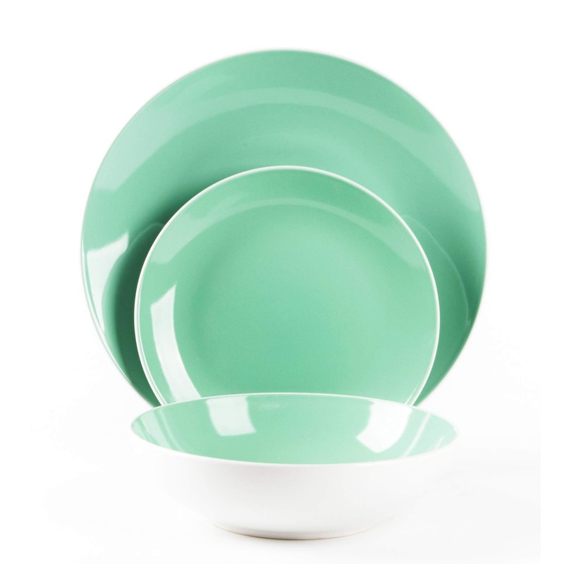 HomeVss, Stoneware Coupe Shape 18pc Dinnerware Set, Outside White + Inside Teal