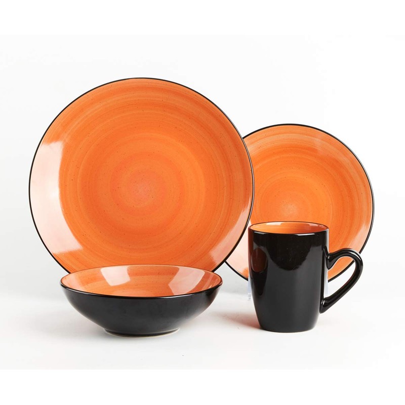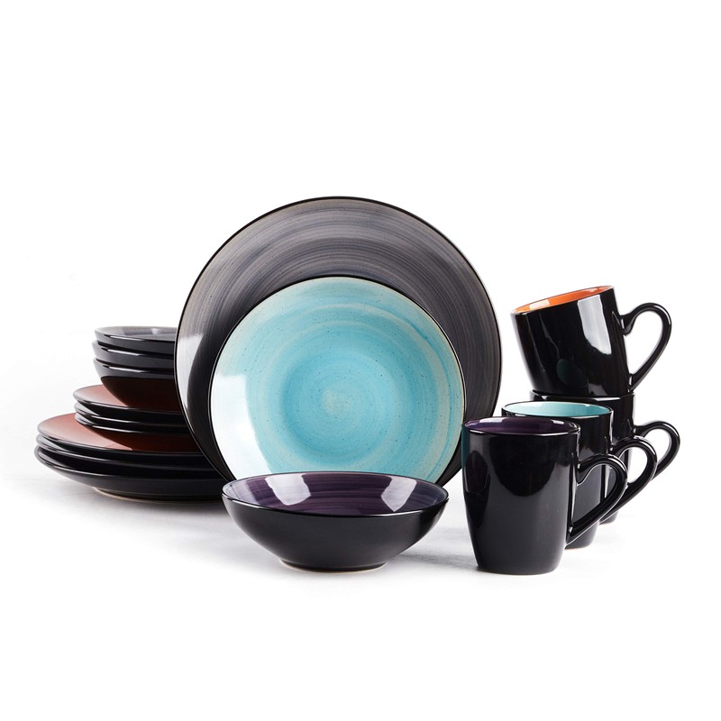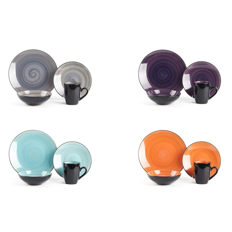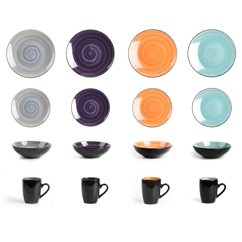 HomeVss, Stoneware Sonoma 16pc Dinnerware Set, Black + Speckled Spin Wash Mix Colors Grey, Orange, Purple, Turquoise