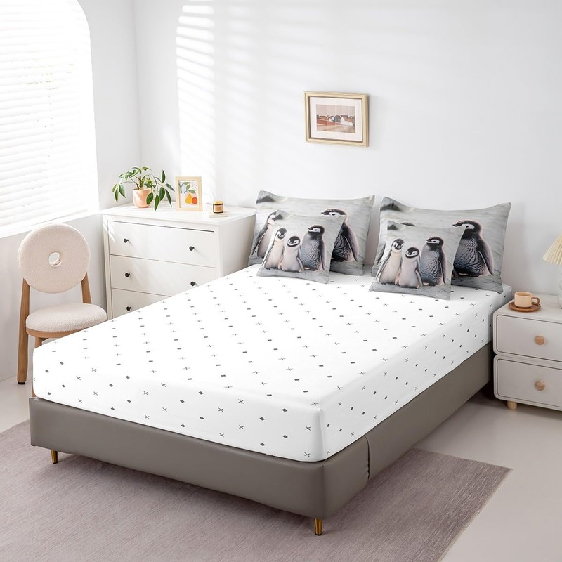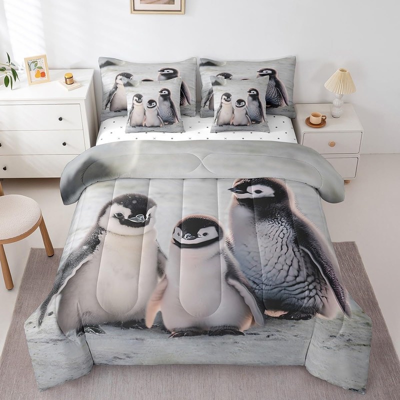 Homewish Penguin Family Kids Comforter Set 7 Piece Twin Size,Cute Kawaii Fluffy Penguin Print Reversible Quilt Set,Antarctic Snow Style Wild Animal Bedding Set with Comforter,Sheet,Pillowcase