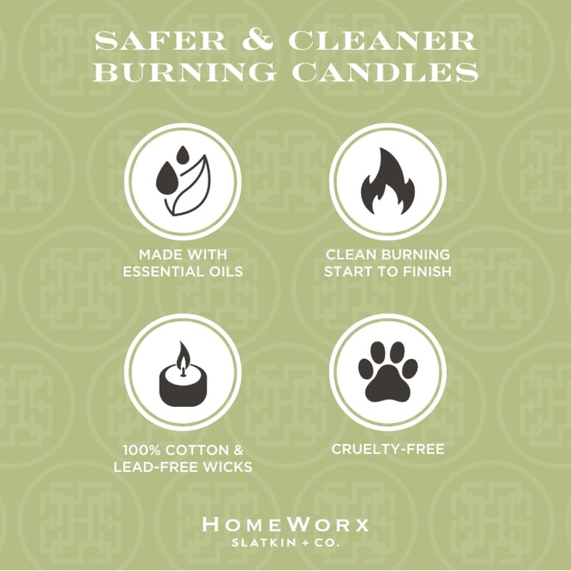 - CAREFULLY CRAFTED: HomeWorx by Slatkin & Co. candles are crafted with a proprietary wax formula and essential oil blend, that burn cleanly and last 30-55 hours. Our candles have a scent output like no other. Each 18-oz candle has a total burn time of 30-55 hours.