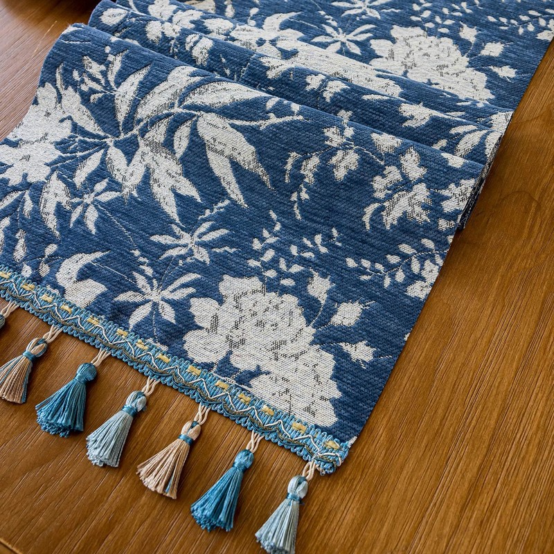 - Features: Elegant navy blue and white chenille fabric featuring a botanical floral pattern, perfect for adding sophistication to any table setting. Crafted from durable jacquard fabric with intricate weaving that creates a textured, dimensional floral design. Adorned with luxurious multi-toned blue and beige tassels along both ends, adding an extra touch of elegance and visual interest. Features an ornate trim with coordinating braided border above the tassels, completing the sophisticated look