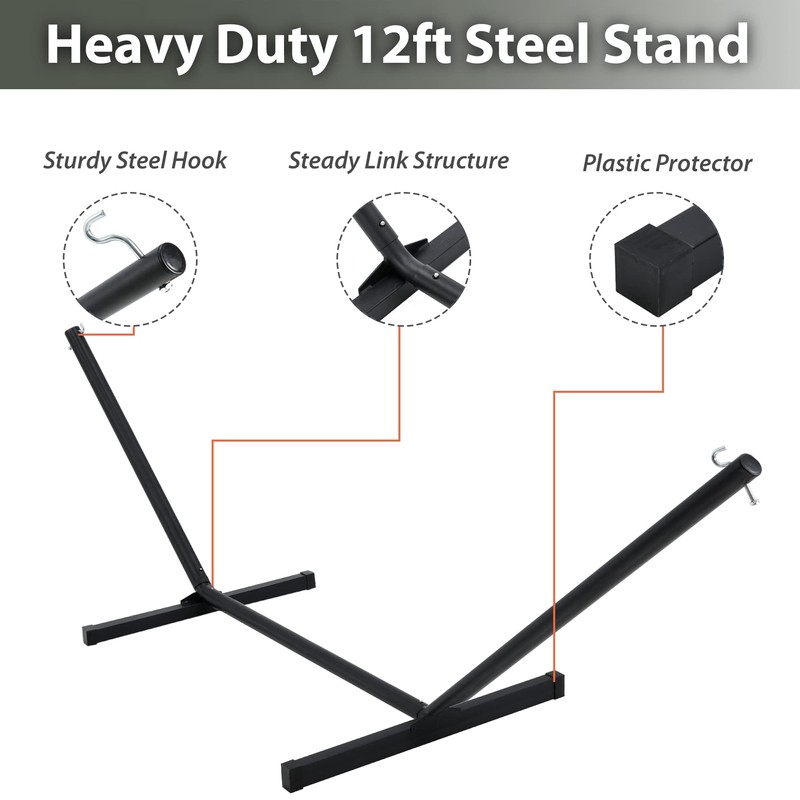 - Comfortable & Durable DesignHammock with quality & coated steel stand, hand-woven strong ropes, double-layer quilted polyester fabric with poly fiber filling is durable to safely support a maximum capacity of 480 pounds. A detachable large soft pillow offers superior comfort when using.