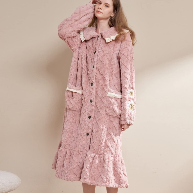Homgro Women's Long Sleeve Robe Winter Soft Fuzzy Plush Button Up Housecoat Floral Warm Fluffy Fleece Ruffle Frill Nightgown Cute Cozy Duster Robe Loungewear Pink Medium