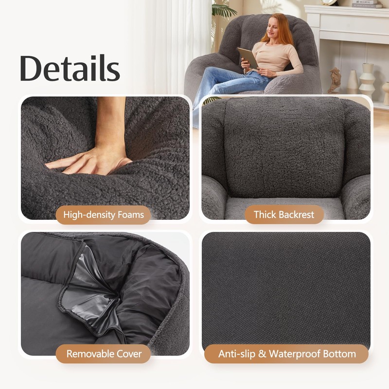 - User-friendly design: With two zippers on the bottom of the lazy sofa chair, the fluffy chair's cover can be removed for convenient cleaning and maintenance, ensuring the sofa remains aesthetically pleasing and hygienic for a long time. Non-slip fabric on the bottom of the sofa, which provides a stable and secure seating experience. Equipped with a top handle, the bean bag chair sofa can be easily moved to desired locations within your home, allowing for flexible use in different areas.