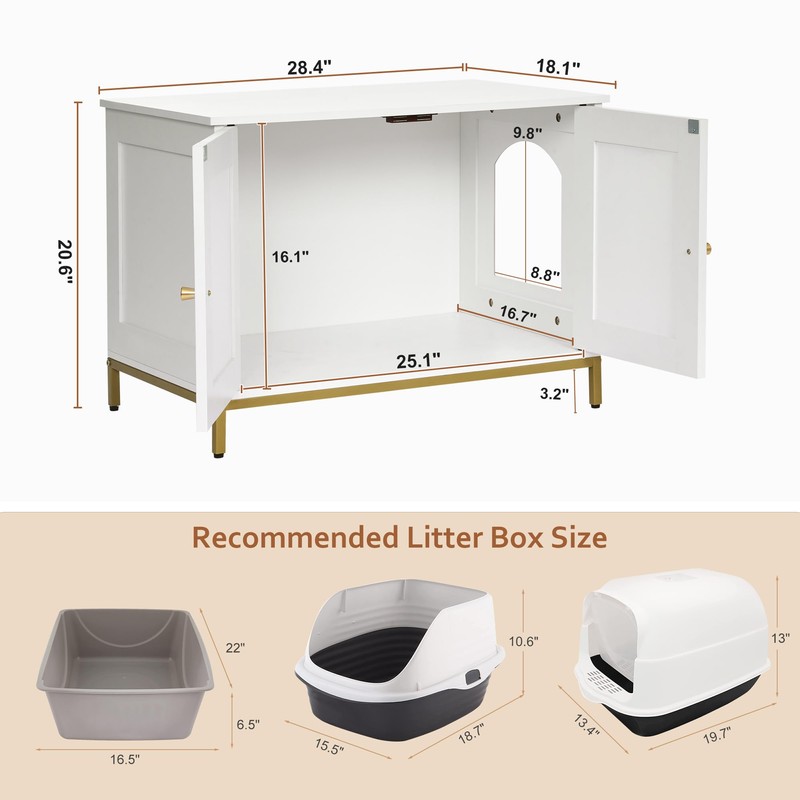 - Modern style: The cat litter box cabinet features white finish and metallic gold-colored metal frame, adding an elegant and stylish touch to your home decor. Its minimalist design and exquisite detailing inject a touch of luxury and sophistication into your living space.