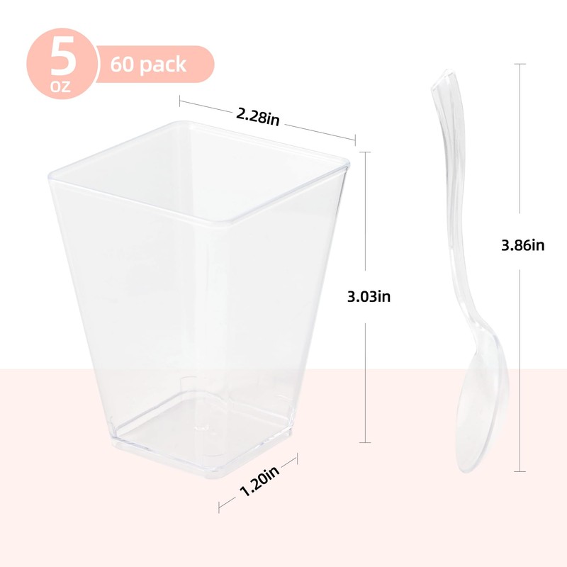 Elevate your event with our 5 oz. plastic dessert cups, perfect for a variety of occasions such as grand weddings, fun birthday parties and cozy family gatherings. Each set includes 60 high quality clear plastic cups with 60 matching spoons. These cups are made of food grade plastic, BPA free, sturdy and durable to ensure safety and health. Perfect for serving a variety of small desserts such as jelly, pudding and ice cream, let your guests enjoy every delicious bite. The transparent design not only looks elegant, but also highlights the colors and layers of your desserts, making them even more appealing. The included spoon adds extra convenience, allows the desserts to stay fresh so your guests can enjoy the treats to their heart's content. Our disposable dessert cups make cleanup a breeze and make every party sweet and memorable! Whether you're hosting an upscale wedding, a lively party or a friendly get-together, these dessert cups are the perfect choice.