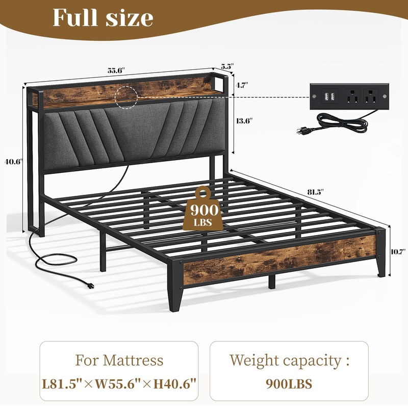 - Smart Charging Convenience: The integrated full size bed frame and headboard features with charging station, allowing effortless charging of phones, tablets, or lamps, keep devices powered without leaving your cozy full bed.