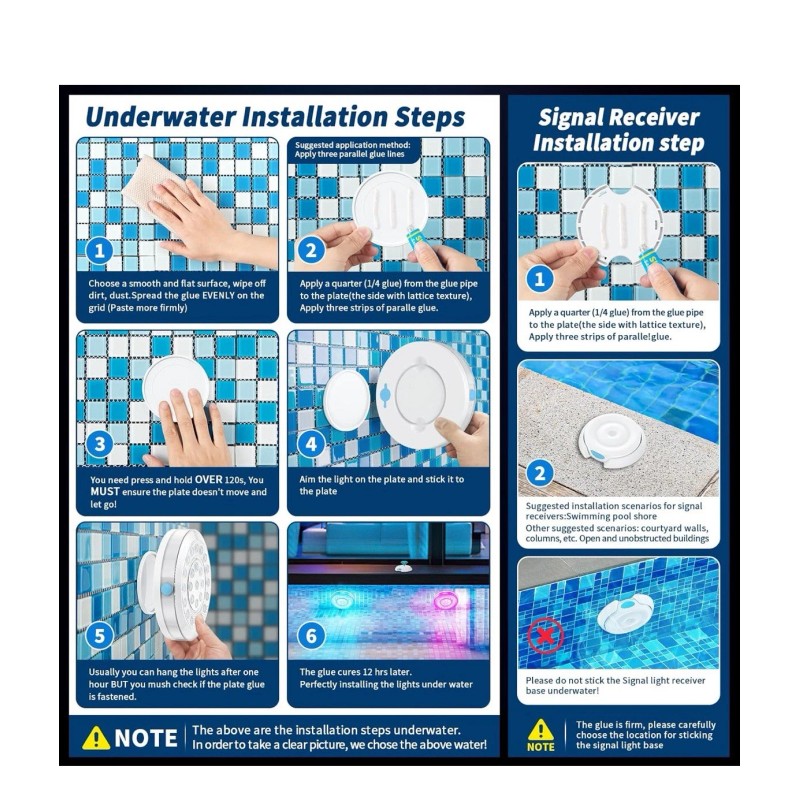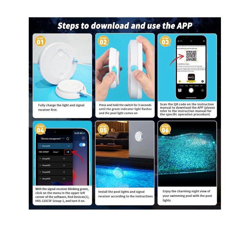 🌐The Signal Receiver: The APP controls the light by controlling the signal receiver. Please keep the distance between the signal receiver and the light within 35 feet. You can fix it on the edge of the swimming pool or on the courtyard wall. The signal receiver cannot be placed underwater to maintain good signal.