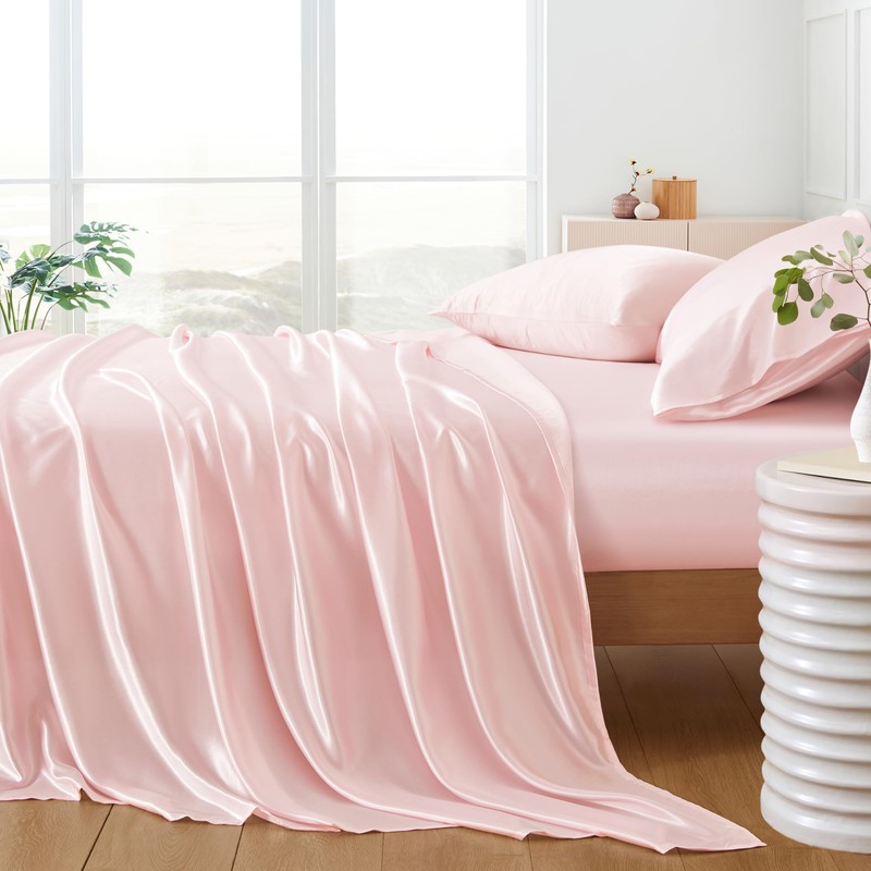 HommxJF 5Pcs Blush Pink Silk Sheets Full Satin Sheets Set Full Size Sheets Silky Comforter Bedding Sheets with 1 Satin Flat Sheet,1Deep Pocket Fitted Sheet,3 Pillowcases with Envelope Closure