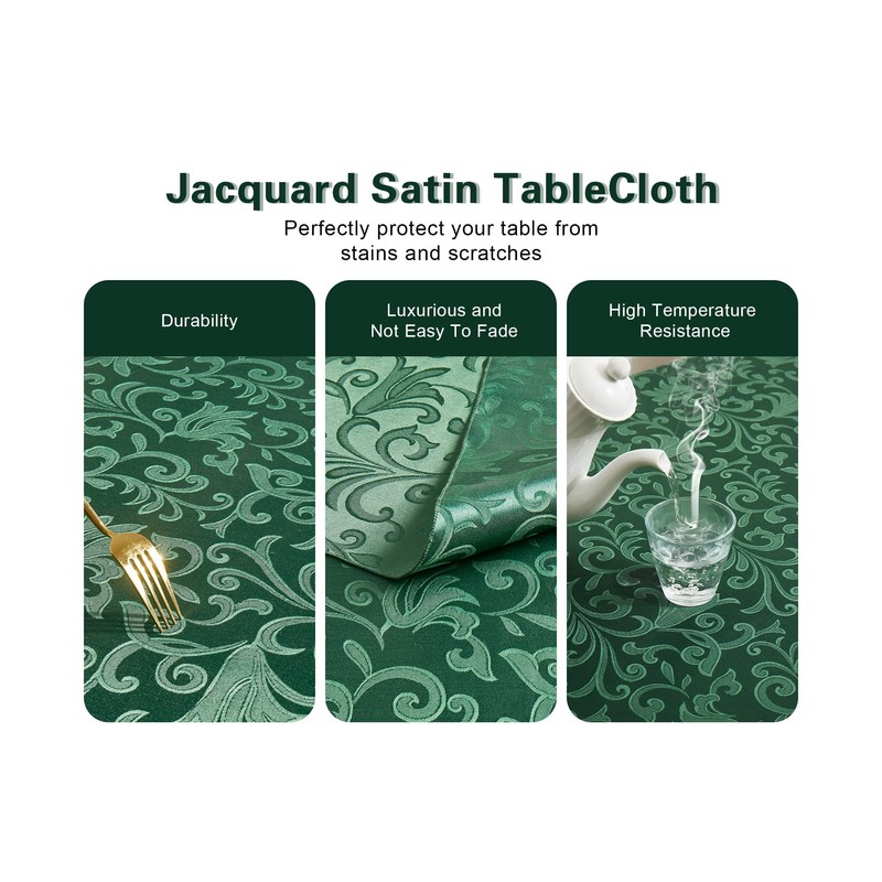 - Jacquard Craft -- HommxJF Jacquard Satin Tablecloth uses a precision crochet machine to carve brocade jacquard patterns on the hard and luxurious surface of the Satin fabric, making the appearance and use of the mat more advanced. At the same time, your dining environment has become high-end, luxurious, and upscale, making dining more enjoyable. The satin tablecloth also play a role in protecting the surface of the table and reducing the noise of the plates and utensils.