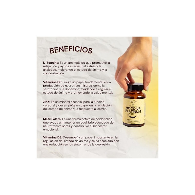 - Teanina y el Glicinato de Magnesio en Mood Up Platinum promueven un sueño reparador y un despertar fresco y lleno de energía. Un sueño de calidad es crucial para un buen estado de ánimo y bienestar general. 馃挭銆怓ÓRMULA OPTIMIZADA銆慛uestra fórmula incluye vitaminas y minerales como la Vitamina B6, Zinc, Metil Folato, Vitamina D3 y Vitamina B12, que son esenciales para el funcionamiento óptimo del sistema nervioso y el mantenimiento de la salud mental. 馃攼銆怗ARANTÍA DE HOMODEUS銆慛os encanta y nos enorgullece nuestro producto por lo que respaldamos esto con una garantía de devolución total. Tenga la confianza de que este producto contiene los ingrediente naturales que son principales y necesarios para nutrir tu sistema cognitivo. Cualquier duda, pregunta o sugerencia no dude en contactarnos por nuestras redes. Ordene ahora y tenga la seguridad de que este producto estará a la altura de sus expectativas.