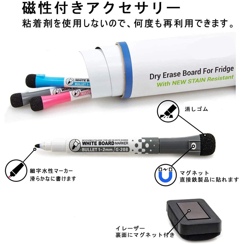 • A value 6-piece set. Thick magnetic sheets (white) - 2 sheets - 3 colored dry erase markers - Fine line: 3 pieces (black, red, and blue) - Dry erase eraser: 1 piece