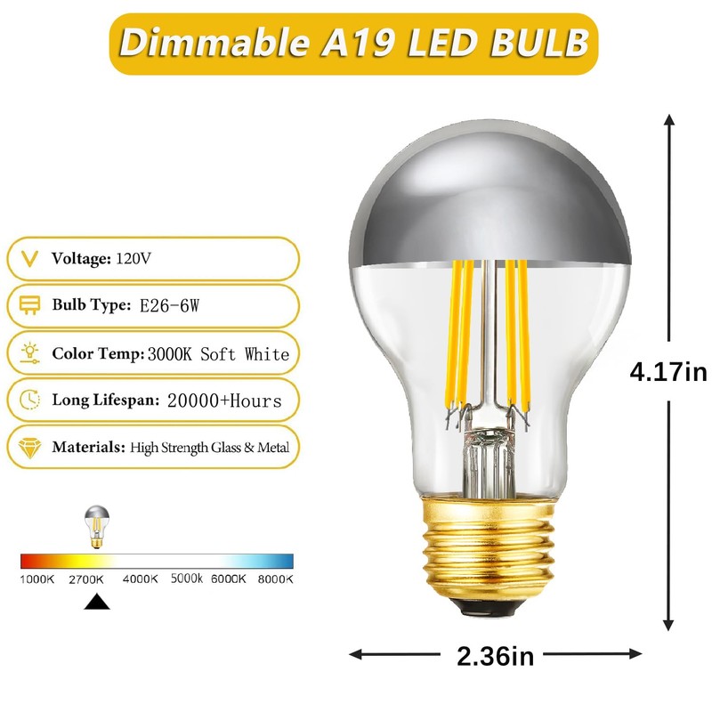 - 【Energy Efficient】- These chrome dipped light bulb are highly energy-efficient, using only 6W of power while producing the same amount of light as a 60W incandescent bulb, saving you money on electricity bills and reducing your carbon footprint. Average 20000 hours lifespan for the E26 Dimmable Half Chrome LED Bulb