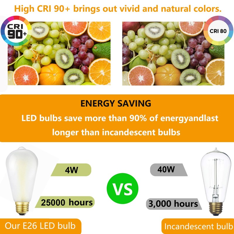 • 【Energy Efficient】-These ST58 frosted vintage LED bulbs are highly energy-efficient, using only 4W of power while producing the same amount of light as a 40W incandescent bulb, saving you money on electricity bills and reducing your carbon footprint. Average 25000 hours lifespan for the Dimmable Vintage LED Edison Bulb