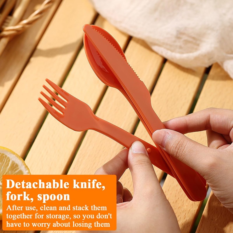 • 2. Innovative Interlocking Design:Designed for convenience, the fork, spoon, and knife clip together firmly, preventing them from rattling or getting lost. This smart design ensures easy access and organized storage during camping, hiking, or picnics.
