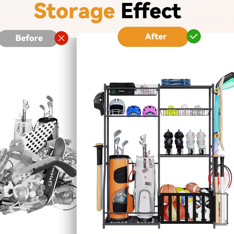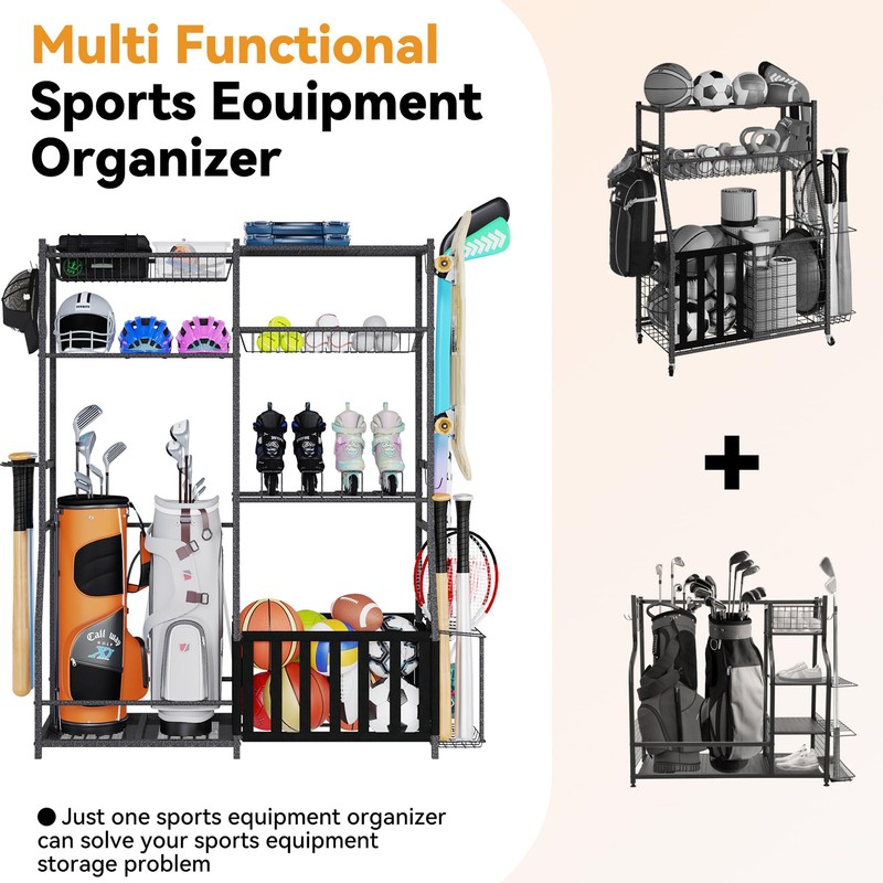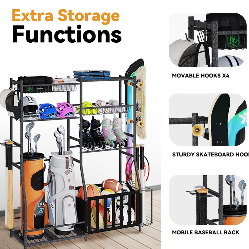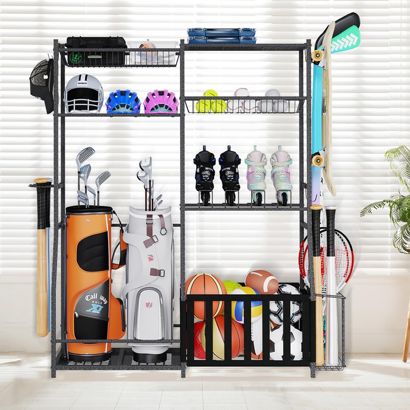 - ๐๐ฎ๐ฅ๐ญ๐ข๐๐ฎ๐ง๐๐ญ๐ข๐จ๐ง๐๐ฅ ๐๐ฉ๐จ๐ซ๐ญ๐ฌ ๐๐ช๐ฎ๐ข๐ฉ๐ฆ๐๐ง๐ญ ๐๐ซ๐ ๐๐ง๐ข๐ณ๐๐ซ: Equipped with storage baskets of different sizes, 2 golf storage racks, basketball storage boxes, racket racks, and 4 suspension brackets, it can meet your storage needs for different items