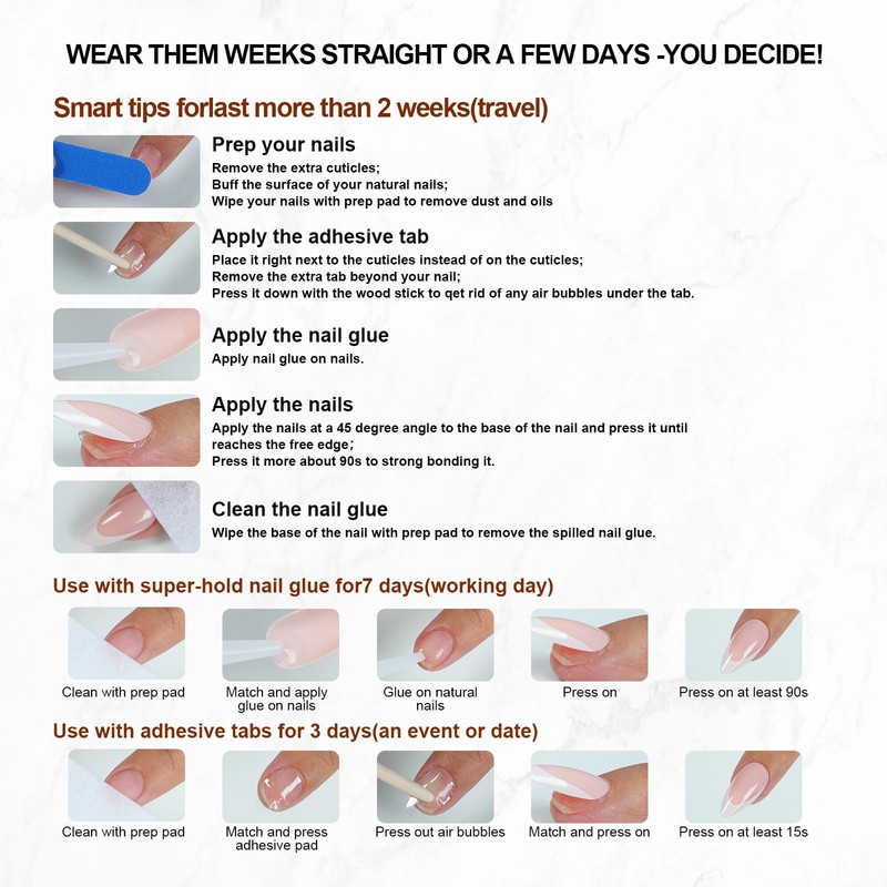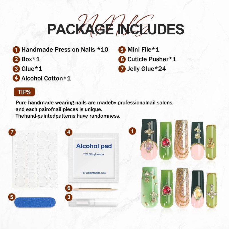 - 【Package Includes】Handmade pressed on nails * 10, Nails adhesive tabs * 24, Nail file * 1, Manicure stick * 1, storage box * 1, Glue * 1. For usage instructions, please refer to the product images.