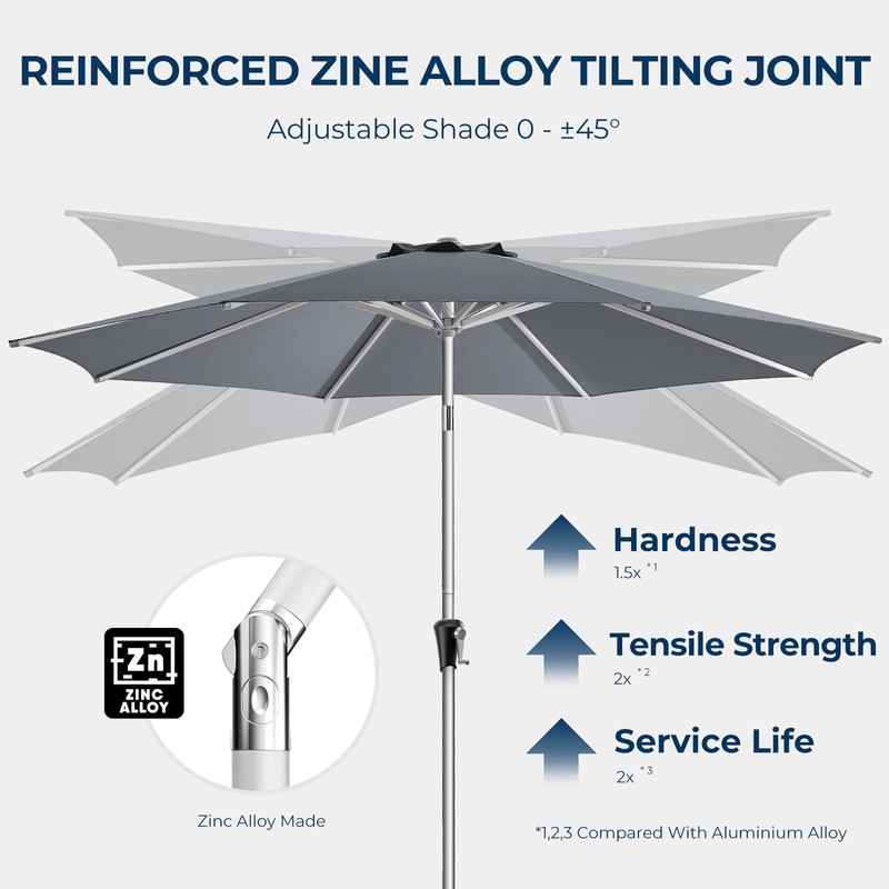 - EASY TILT SYSTME: Zinc alloy tilting systems provides 0-±45°adjustment. Adjust the angle and enjoy under shade all day long.