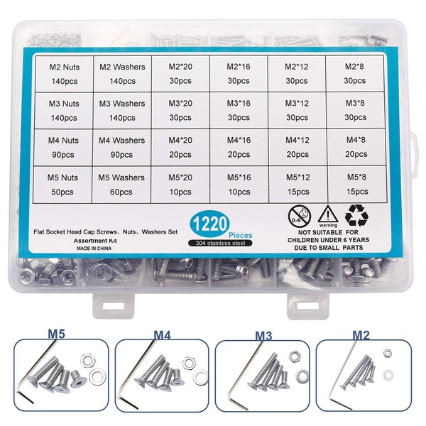 Homtone 1220 Pieces Screws Set, M2 M3 M4 M5 Made of 304 Stainless Steel Hex Head, Socket, Head, Bolts, Nuts, Washers, Various Sizes, with Hex Key (Flat Head)