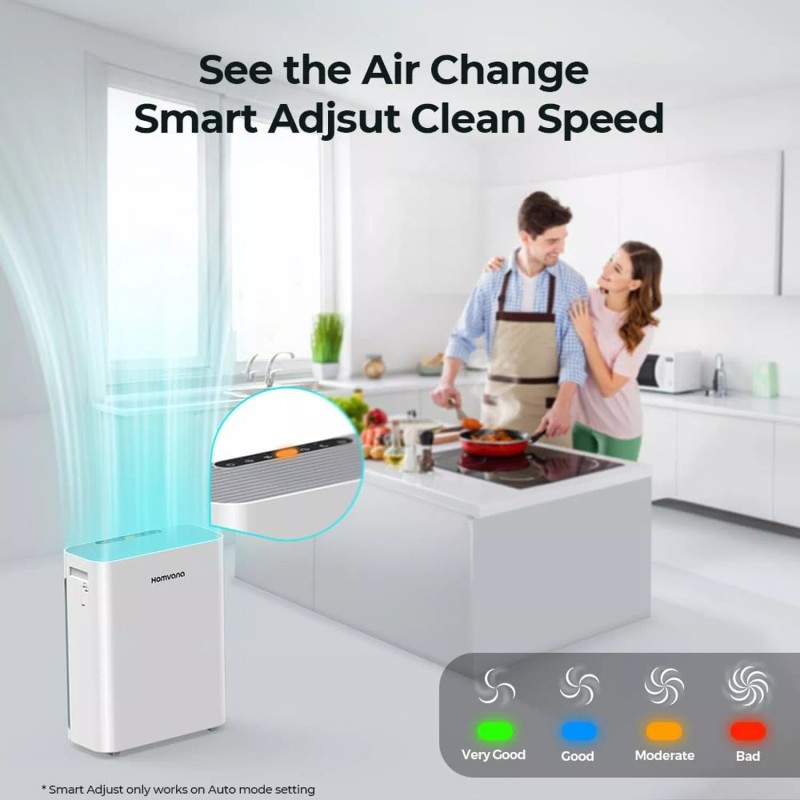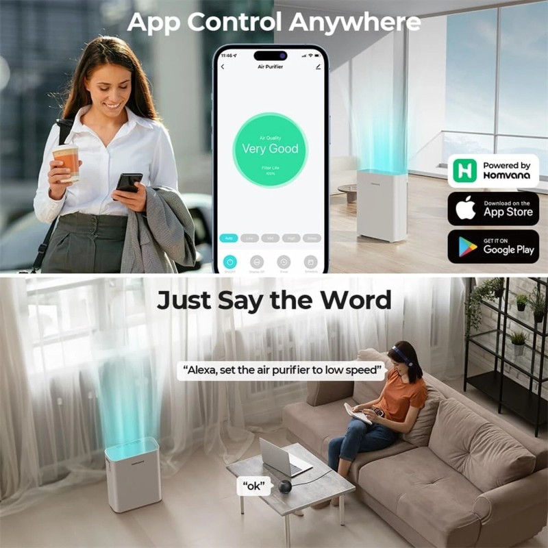 - Easy-To-Use Smart AppWith the free and newest upgraded Homvana App, especially for its powerful system and concise UI, you can easily monitor and manage your smart air purifier anytime and anywhere. About to go home? Just set it on your way, and step into your house with clean & healthy air swooping on you.