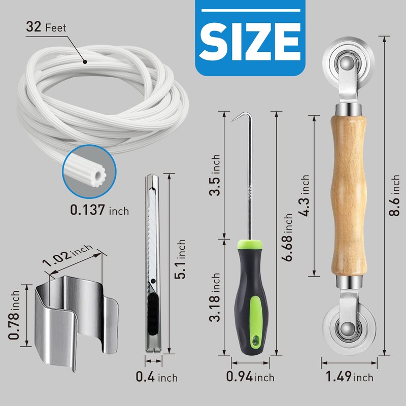 - Five-In-One Screen Repair Kit: Equipped with the tools you need to install, repair and replace door and window screens, saving you time and effort on installation. Package includes Screen Rolling Tool, Spline Removal Hook, 8Pcs Window Screen Installer Clips, 32ft Screen Retainer Spline and Screen Cutter