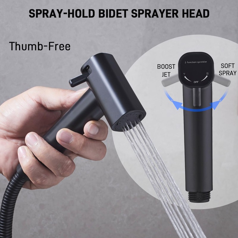 - SPRAY-HOLD BIDET SPRAYER HEAD: Heat-proof ABS bidet sprayer head with 2 FUNCTION soft spray and high-pressure boost jet, left turn for boost-jet, right turn for soft spray, thumb-free construction to keep spray without finger pressing, utility facility for femimine private cleaning, pet washing, rv shower, baby diaper cleaning, floor cleaning, etc.