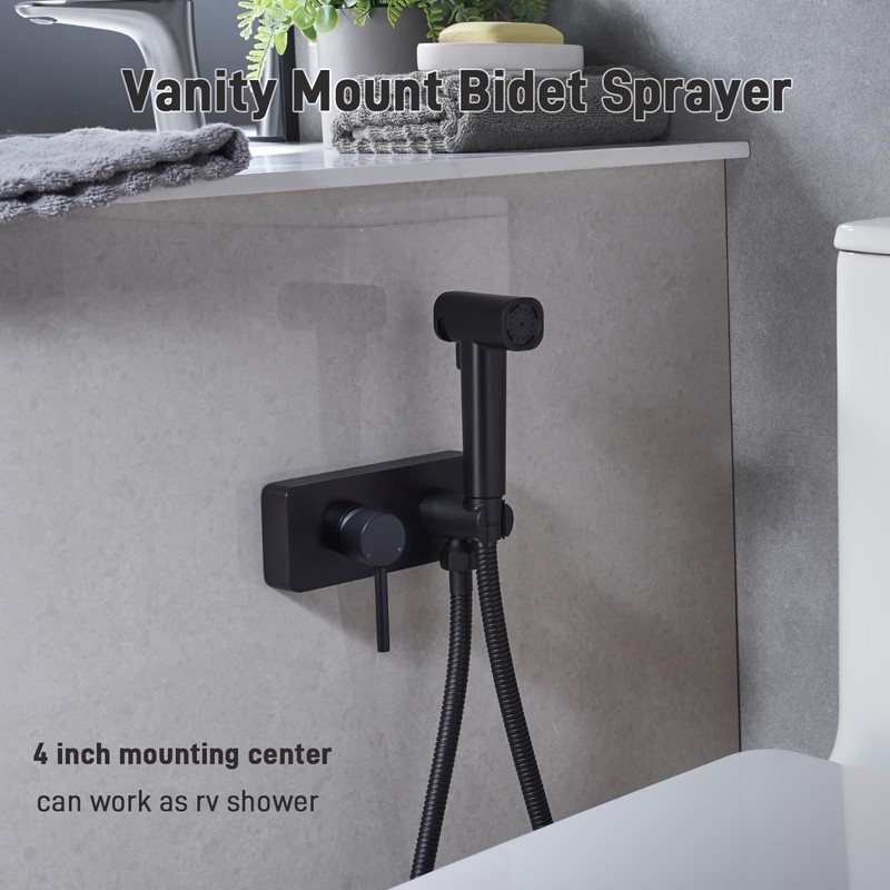 HOMYEP Brass Handheld Bidet Sprayer Attachment for Toilet, Bathroom Vanity Mount Bidet Faucet with Hot and Cold Water, 4-Inch Single Handle RV Shower Valve, Matte Black