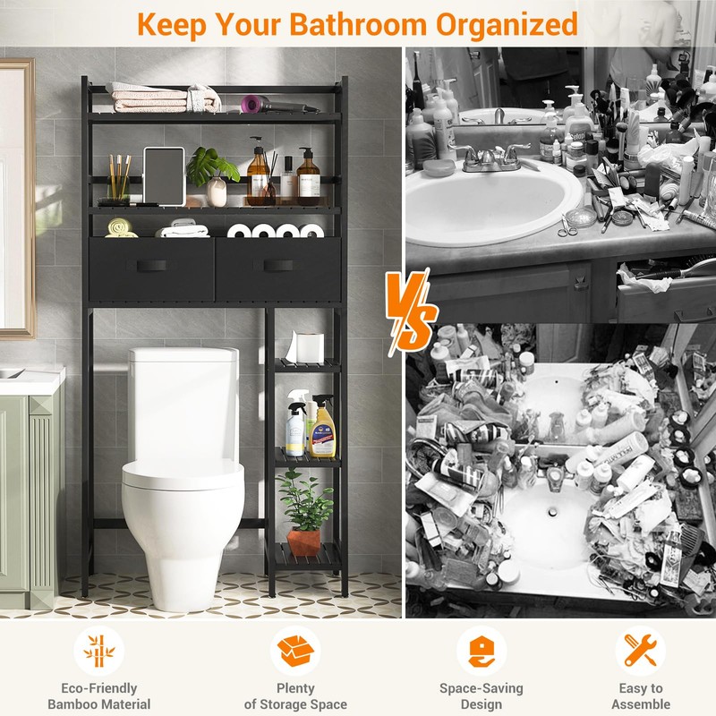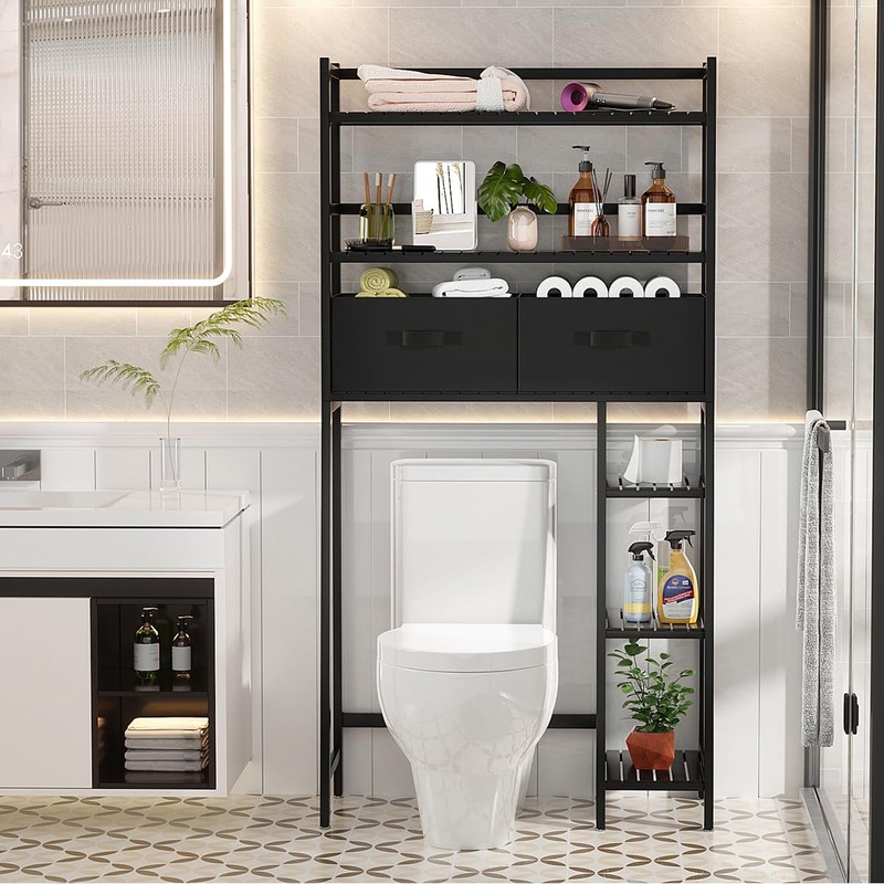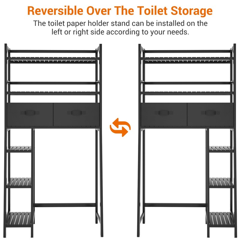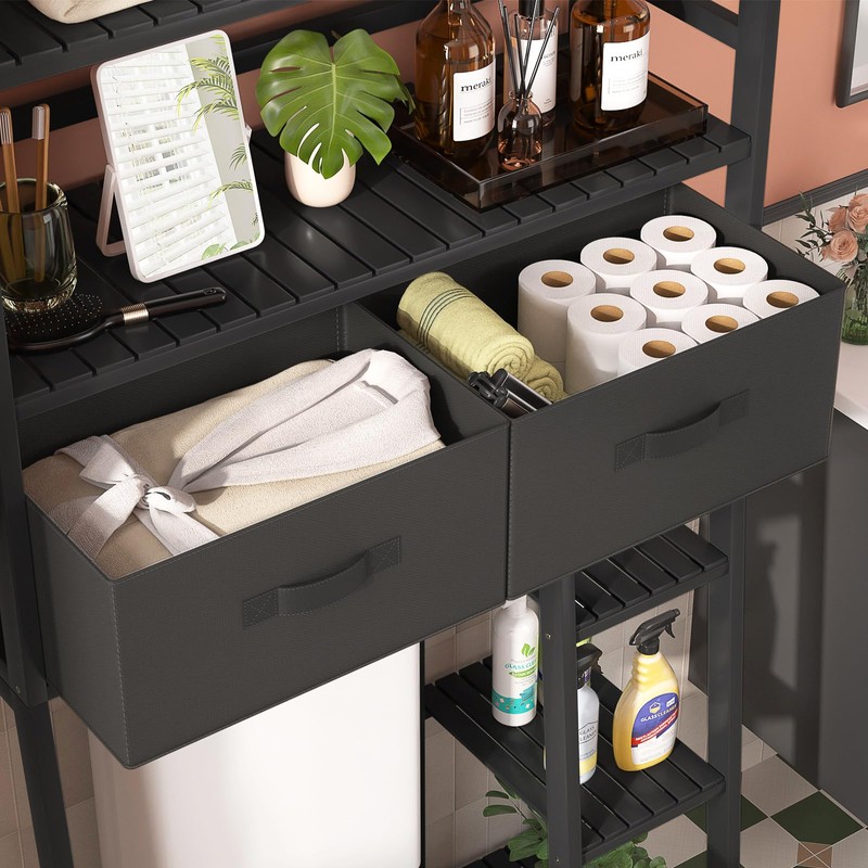 - MASSIVE STORAGE SPACE: This freestanding over toilet storage unit features 2 spacious open shelves for easy access and 2 fabric drawers for privacy. Tiered design gives you plenty of room to place and organize toiletries, tissues, towels, potted plants, and other bathroom essentials. The toilet paper holder stand can be installed on the left or right side based on your needs. Holds approx 18 rolls of toilet paper.