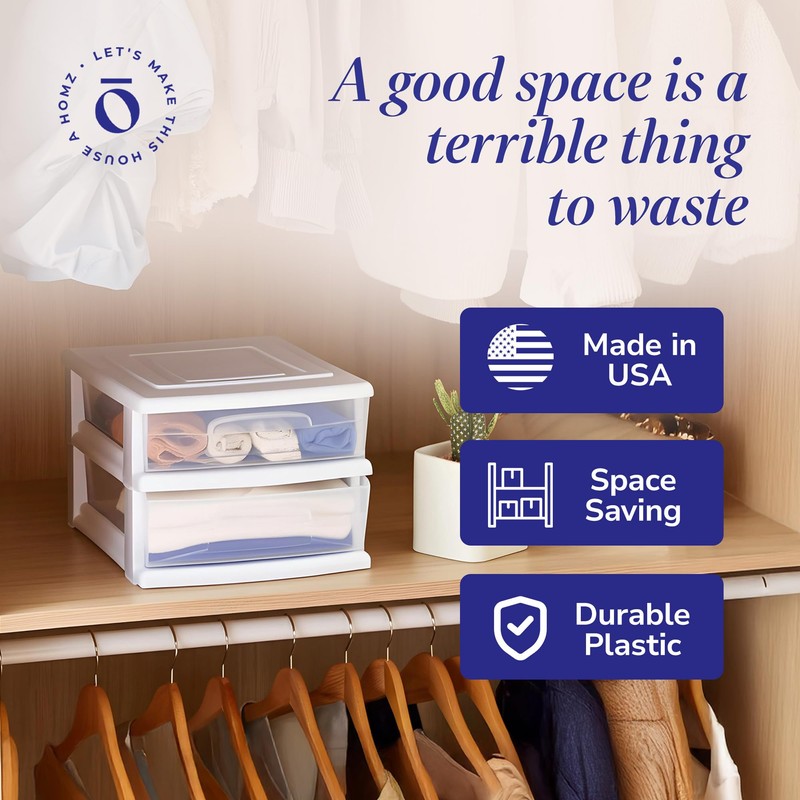 HOMZ 2-Pack 2-Drawer Storage Cart, Clear Plastic Drawers, 14.25" Wide Medium, White Frame - Organizing Drawer Containers for Home, Bathroom, Bedroom, Office, and Classroom