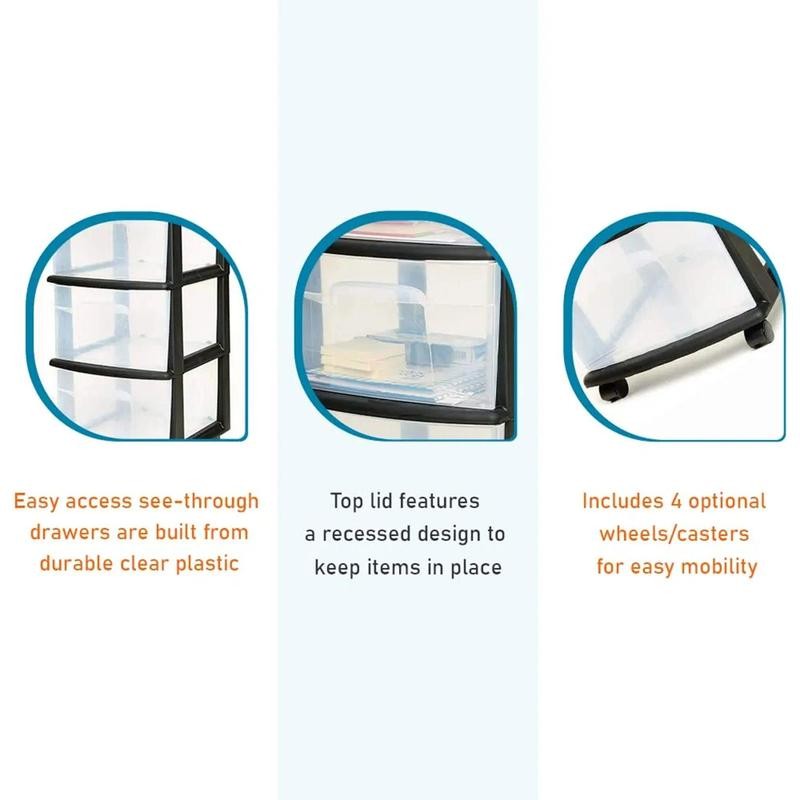 • Clear design with easy-access handles makes it easy to see storage contents without having to open or remove drawers