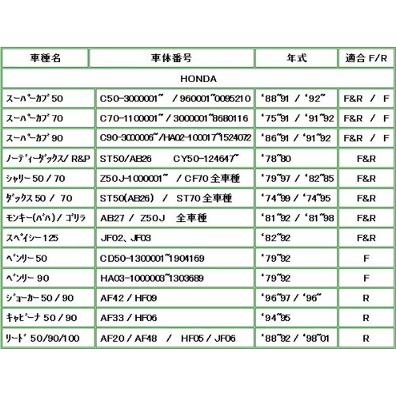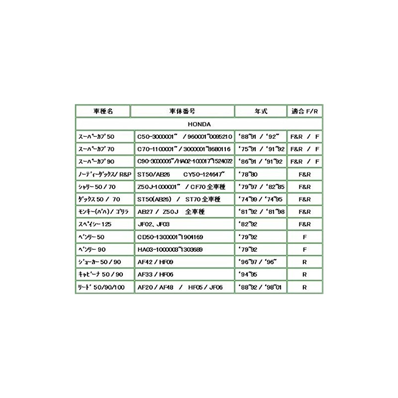 - Fits: Honda Super Cab 50 C50 (P-X,Y/2-8) 93-08/92 F&R/R Super Cab 70/90 C70/HA02-160001~93-98/91-92 F&R/R Press/Little Cab C500 BN/C50L, C50LM 88-01/97-08 F&R Jazz JAZZ AC09(CA50) 86-90/93-97 F&R Cabina 50/90 AF33/HF06() 94-95/94-95 F Tobic AF38 0-9 5 Year F Jo. Lukab AF53 (SNC50) 99-01 R Ave 50/100 (XZ50 1-8)/HC07(XZ100 2-8) 01-08/02-08 F&R CT110 JD01 (CT110P)/(CT110X) 89-89-8 04/04 5-10 F&R/F CBX125 C/F JC12/JC11 84-92 R Little Cab C50L/LM X/Y/1 AA01 97-01 F/R