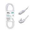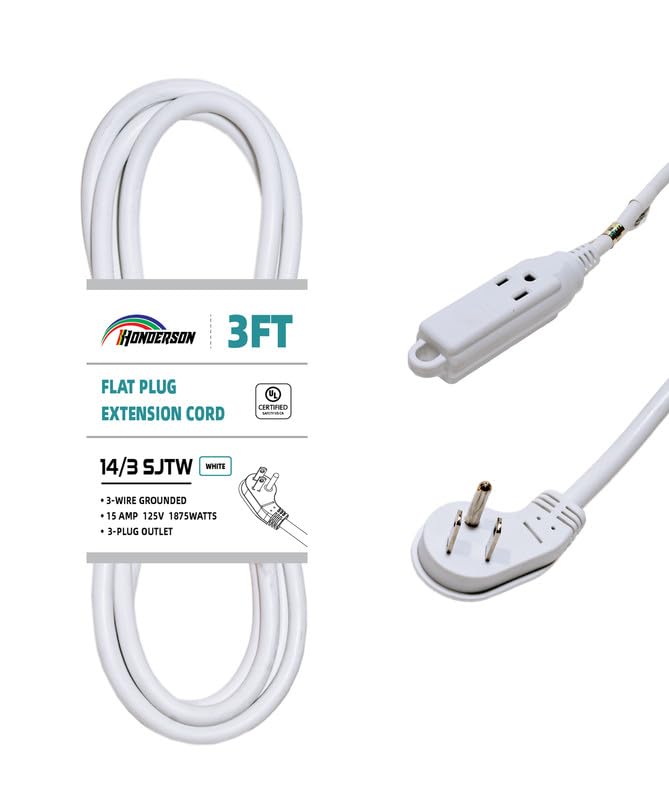 - PERFORMANCE PARAMETER: White 3FT flat plug extension cord, 3-OUTLETS, 14gauge, 3 prong grounded plug, 15amp, 125volt, 1875watt. Temperature Range: -40°F to +140°F.
