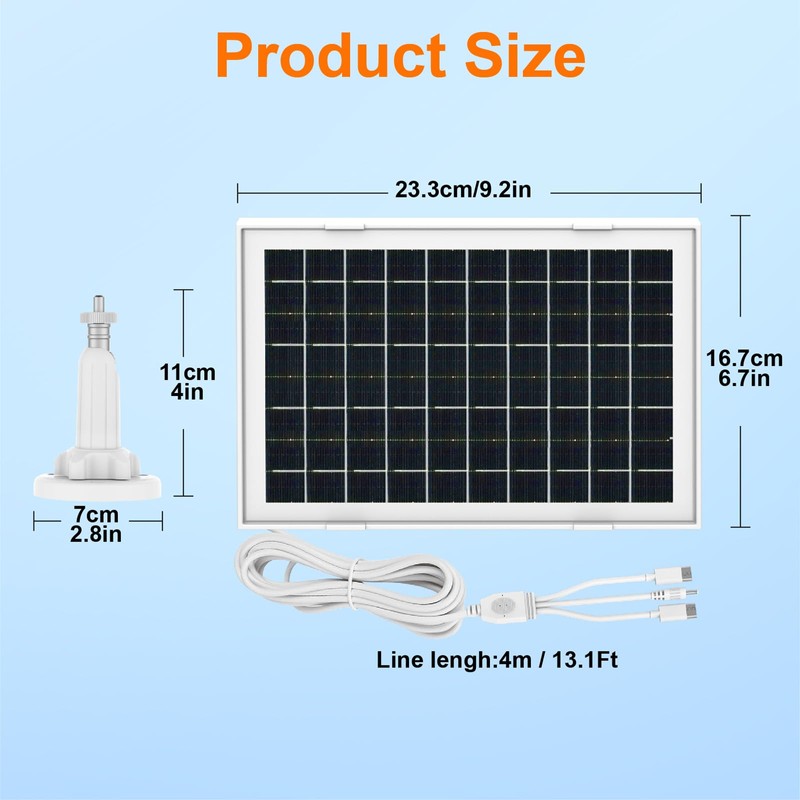 - Compatible with a Wide Range of Devices: honecumi 6V 8W solar panel is perfect for powering security cameras (like Ring, Eufy, Reolink), mobile phones, power banks, camping lanterns, and other small appliances. Equipped with a 3-in-1 charging cable (Micro USB, USB-C, and DC 3.5mm), it provides reliable energy for your devices at home or on the go. (Note: No built-in battery.And is incompatible with any plug-in camera without a battery)