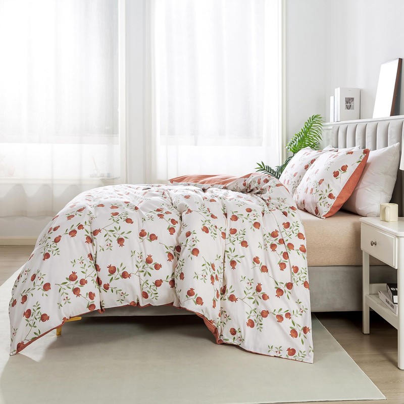 HoneiLife Fruits Duvet Cover King - 100% Cotton Comforter Cover 3-PC, Botanical Bedlinen Set with Zipper Closure & Corner Ties, Pomegranate Comforter Cover Sets