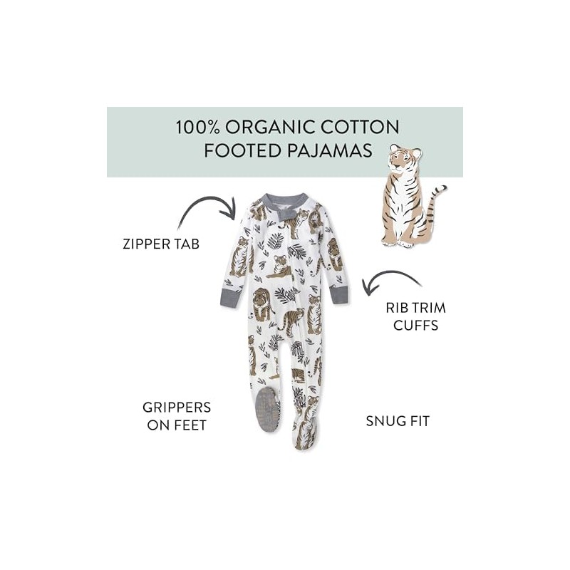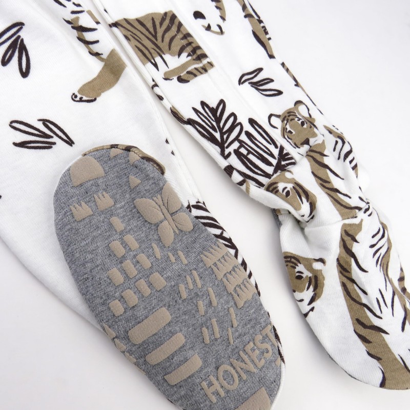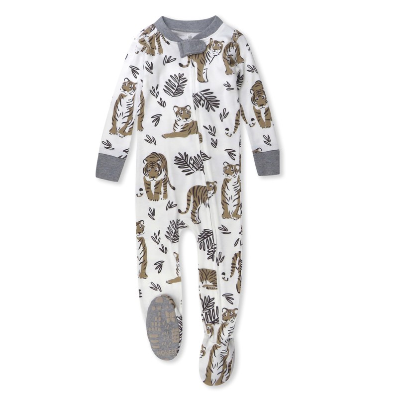 HonestBaby Non-Slip Footed Pajamas One-Piece Sleeper Zip-Front Pjs 100% Organic Cotton for Baby Boys, Tiger Cub, 18 Months