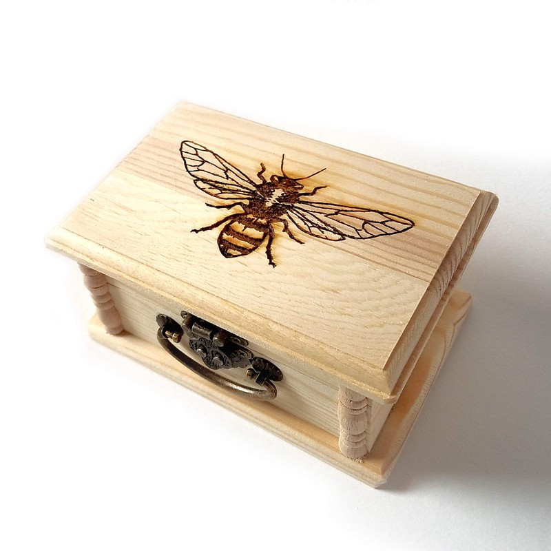 This wooden box comes with a brass-toned metal clasp and matching hinges. It is engraved with our original Honey Bee design.