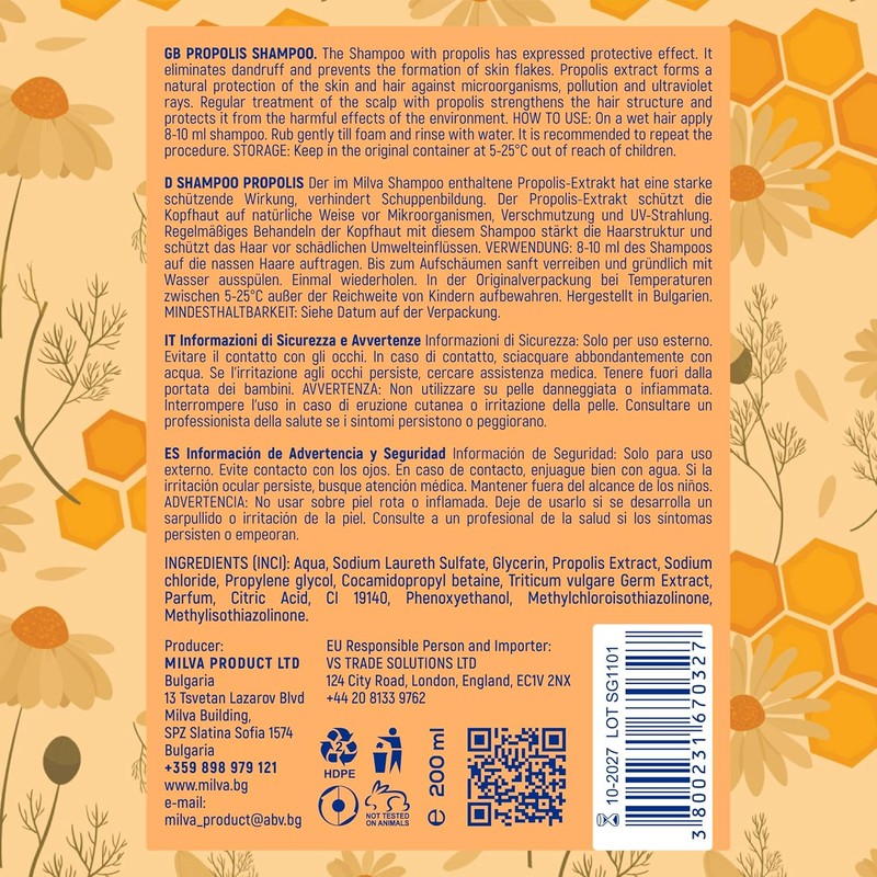Honey-Bee Propolis Shampoo – Strengthens Hair, Promotes Growth, Removes Dandruff - Soothes Scalp, Stops Itching - 200ml