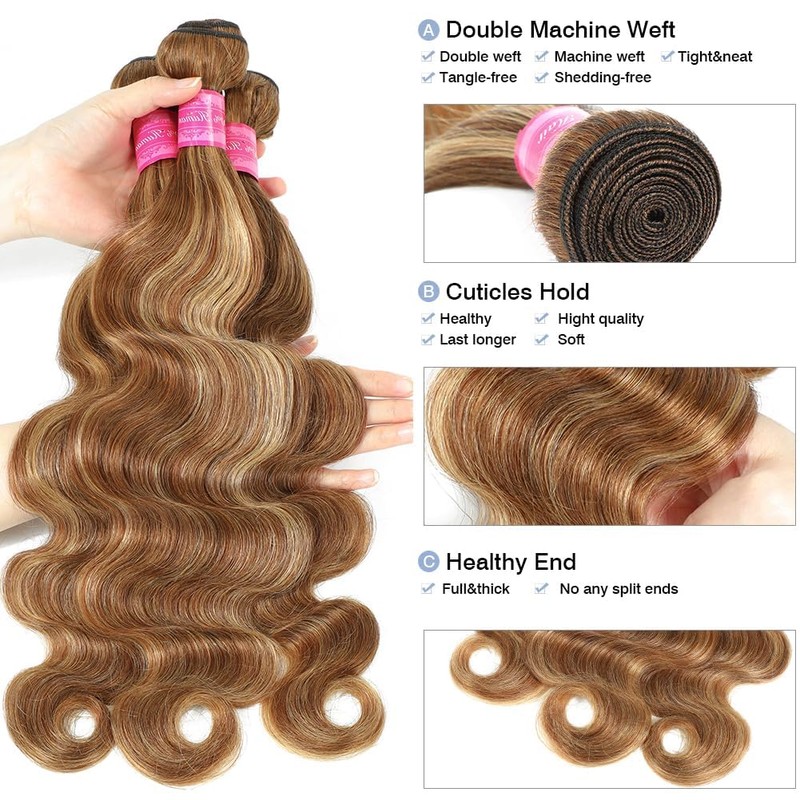 • Hair Material: 100% Unprocessed Virgin Honey Blonde Highlight Body Wave Bundles with 5x5 Closure,Cut from Young Girls Donors Directly,Can be Dyed,Staightened,Bleached or Styled as Your Own Hair