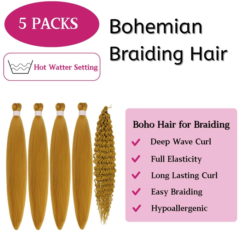 Honey Gold Braiding Hair Pre Stretched Curly Deep Wave Braids Bohemian Hair Prestretched Ez Braid Knotless Synthetic Non Toxic Hypoallergenic