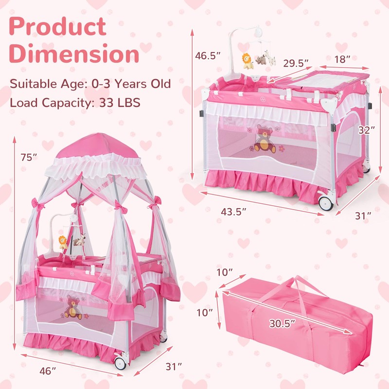 HONEY JOY 4-in-1 Pack and Play with Canopy, Portable Baby Playard w/Changing Table and Infant Bassinet, Cute Toys & Music, Foldable Bassinet for Newborn and Toddler (Hot Pink)