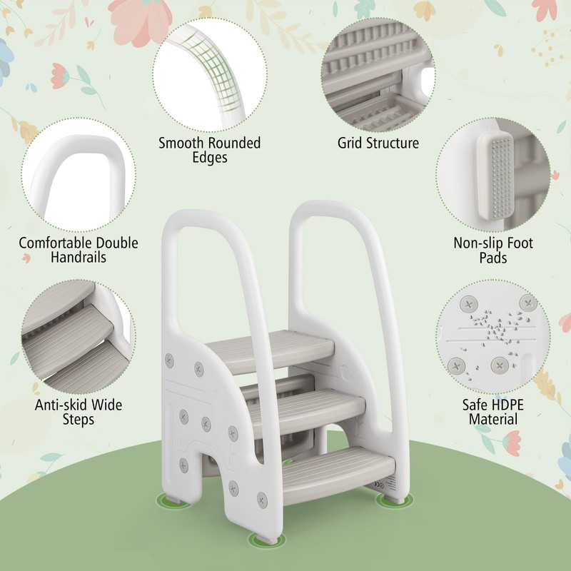 - 【Safe & Kid-friendly Details】Made of safe HDPE material and certified by ASTM & CPSIA, this 3-step kitchen step stool for toddlers ensures long-lasting reliable use. Smooth rounded edges won't scratch the toddler's tender skin. Plus, the comfortable double handrails offer an easy grip for kids to climb up and down.
