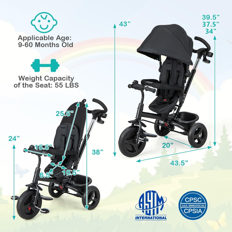 Tricycle Dimension: 43.5” x 20” x 43” (L x W x H)(With Canopy & Push Handle)