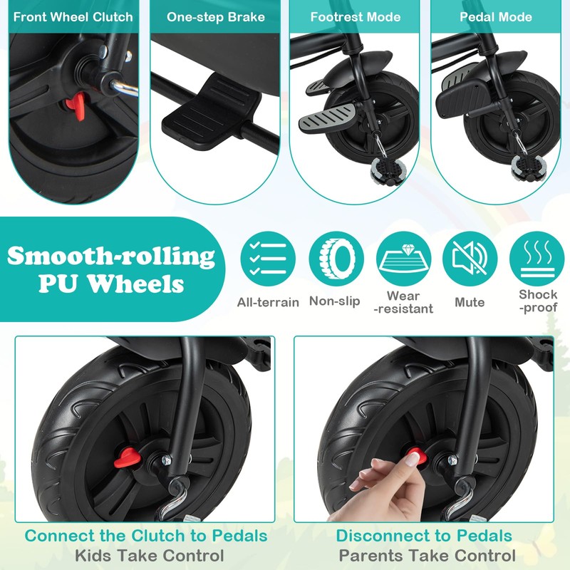 - 【All-terrain Wheels with Clutch】These shock-proof and wear-resistant PU wheels roll smoothly on any surface. Connect or disconnect the clutch to the pedal to shift the wheel control between your child and you, ensuring a secure and joyful ride. Plus, the rear brake adds an extra layer of safety.