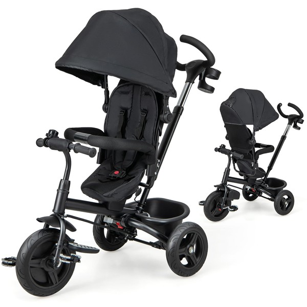 HONEY JOY Tricycle, 6 in 1 Kids Trike Stroller w/Adjustable Push Handle & Canopy, Reversible Seat, Safety Belt, Folding Pedal, Cup Holder, Storage, Push Tricycle for Toddlers 9 Months-5 Years (Black)