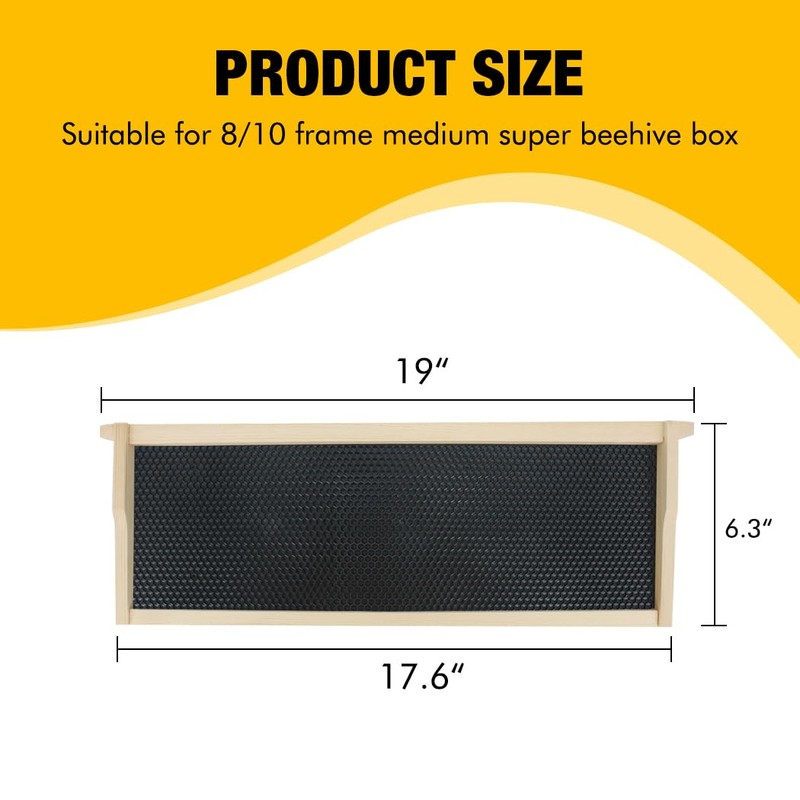 • 1. PRODUCT INFORMATION:Standard medium frame size (6.3″ x 19″ x 1.4″). Fit for 8 or 10 frames beehive or super box.