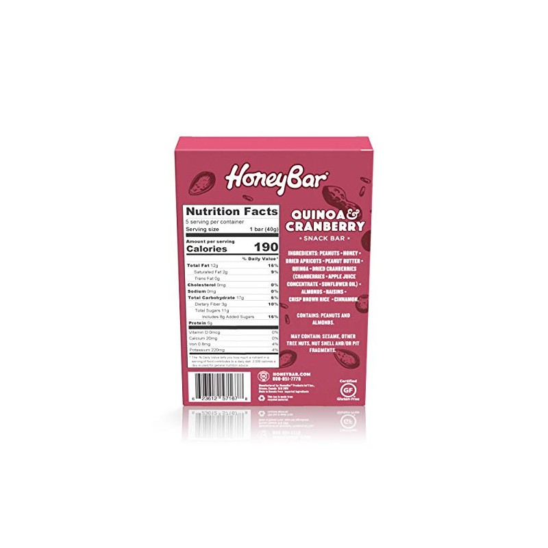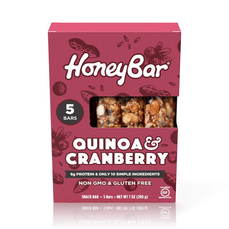 HoneyBar Snack Bar | Certified Gluten Free | Non-GMO | Vegetarian (Quinoa & Cranberry, Pack of 5 Bars)