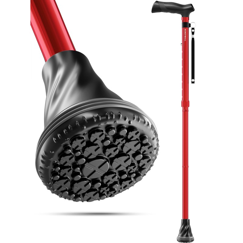 HONEYBULL Walking Cane with Air Cushion for Men & Women - Foldable, Adjustable, Collapsible, Free Standing Cane, Bumper Base Tip, Heavy Duty | Walking Sticks for Seniors & Adults (Red)