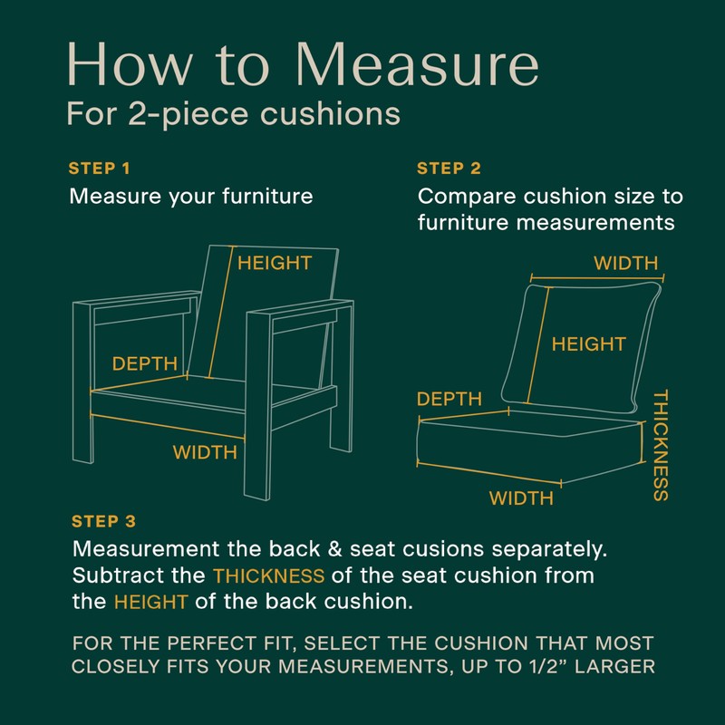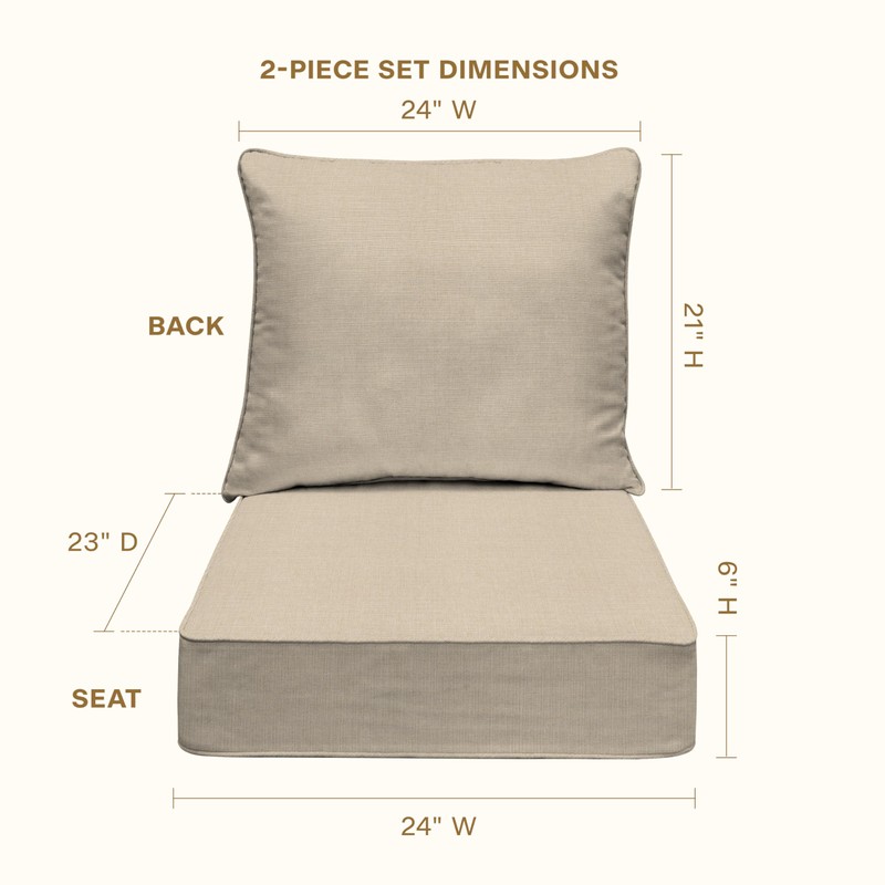 - Universal Fit – Separate seat and back cushions with universal style made to fit most outdoor deep seating and patio conversation chairs. Reversible design allows for use on either side. Seat: 24" W x 23" D; Back: 24" W x 21" H.